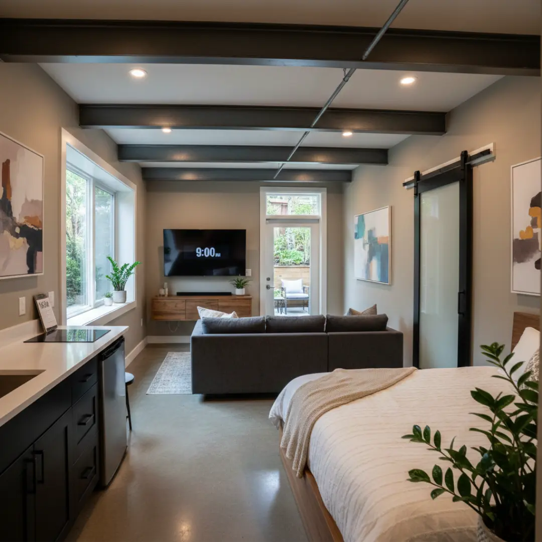 - Bathroom: Can technically share a bathroom with the main house, though we highly recommend adding a private one for rental value.