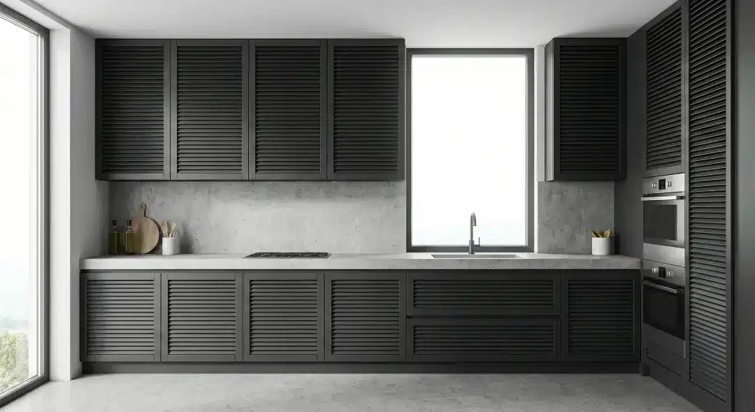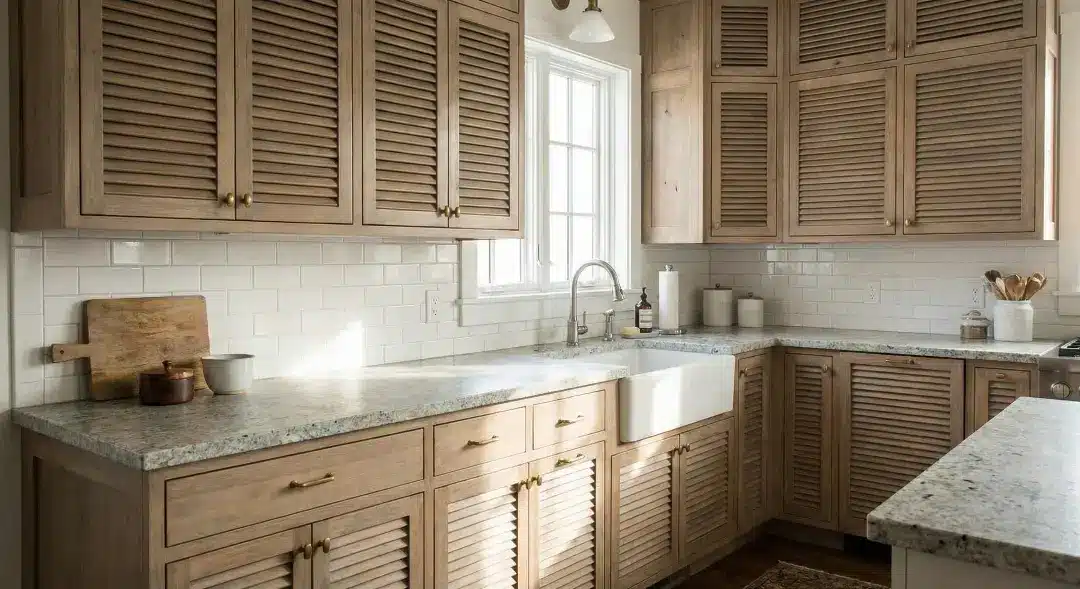 In a kitchen dominated by smooth surfaces, quartz countertops, stainless steel appliances, and glass backsplashes, louvered cabinets introduce necessary texture. craftsmanship that flat surfaces simply cannot achieve. It breaks up the monotony of a large wall of cabinetry, making the room feel larger and more intricate.